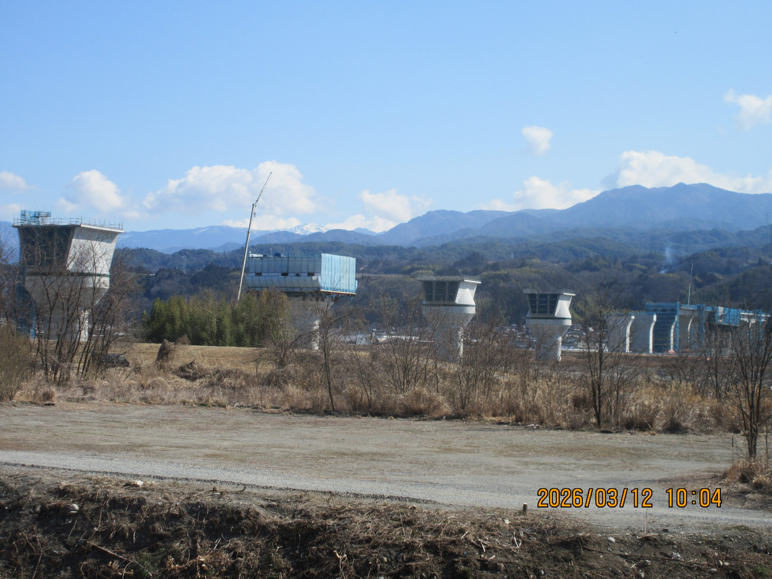 リニア長野県駅(仮称)手前の天竜川に築かれた橋りょうの橋脚だ(26年3/12時点)。右奥が南アルプスで、その先が静岡、更にその先が東京だ。当初計画だと開通は来年2027年の予定だったが、工期は大幅に遅れJR東海は未だに開業時期を示せずにいる。