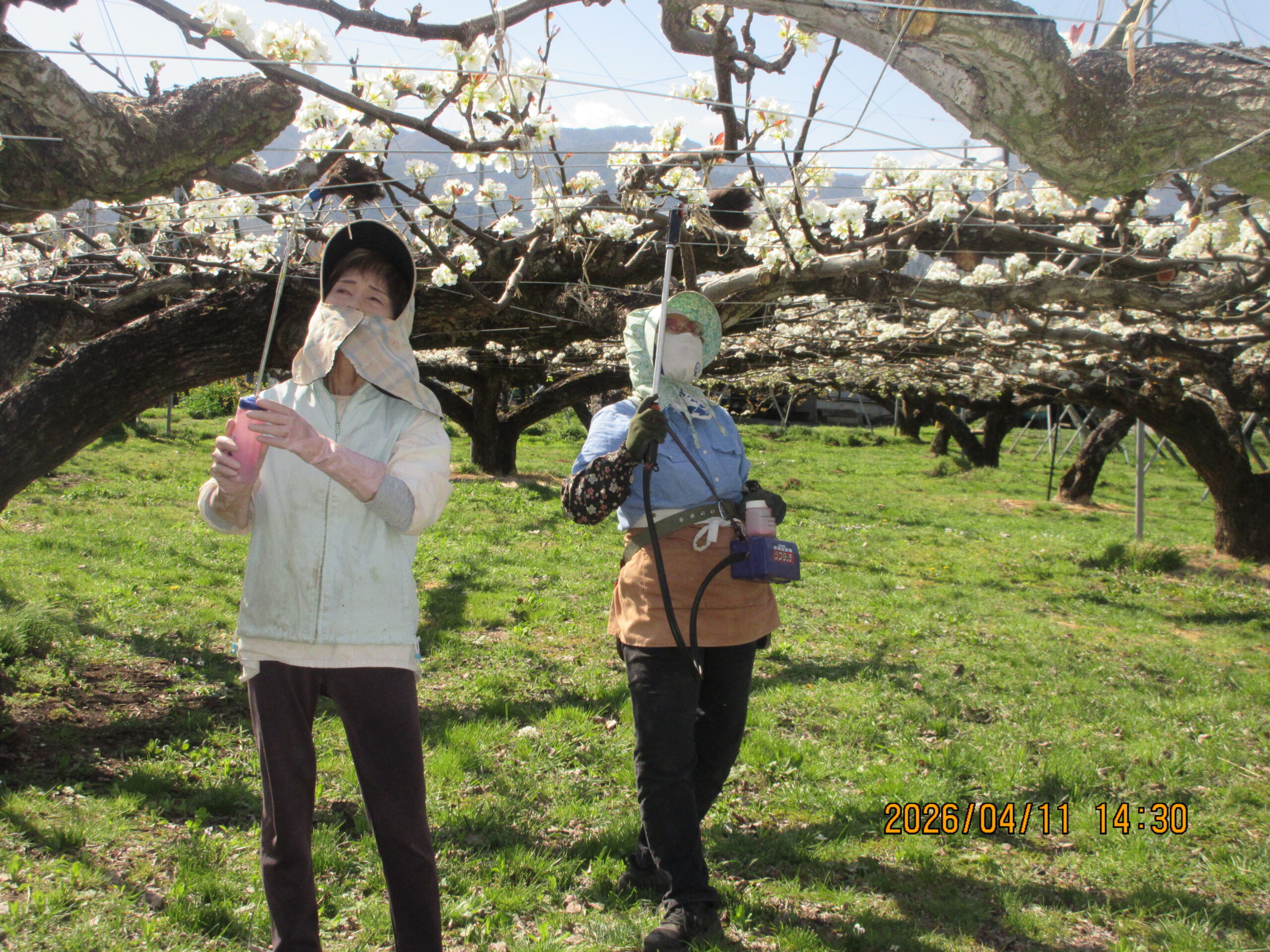 梨の実をつけるために欠かせない授粉作業が4/8から始まった。花粉作りから授粉作業までは天候が良くなければ出来ないため4月に入っての猫の目天気には苦労した。今後、数日間の天気が結実数(収穫量)を大きく左右する。人間の力の及ばない所で、この果物作りは成り立っている。良くても悪くても自然には感謝だ。