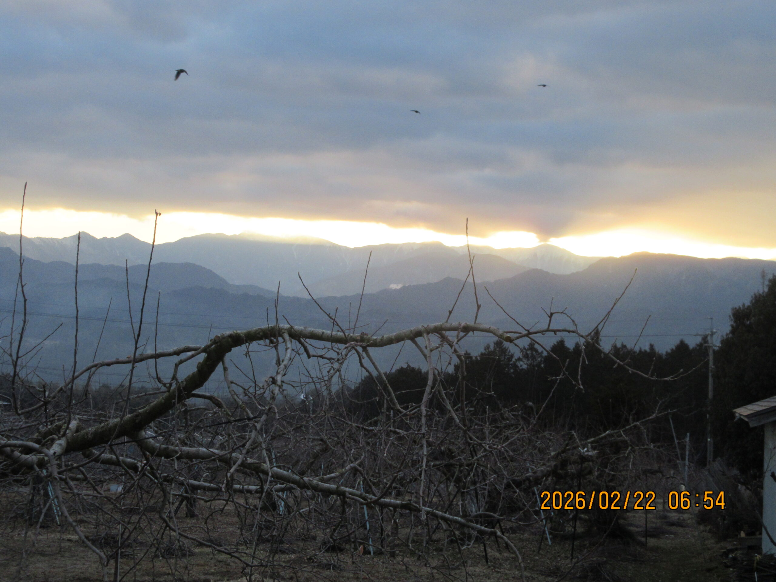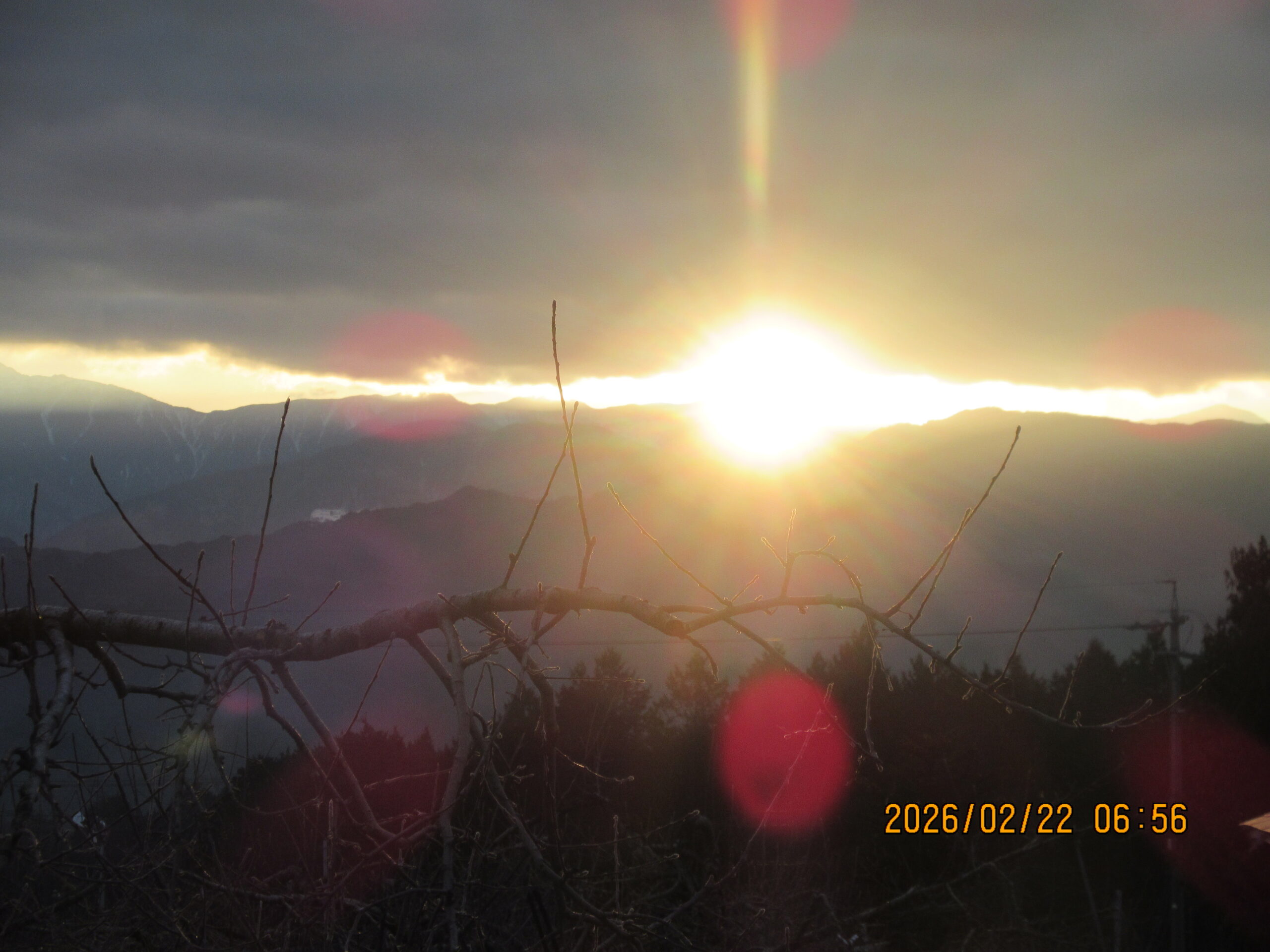 26/2/22 6:54 東の窓(東に位置する南アルプスの稜線と雲の間にできる隙間。天気は下り坂の前兆) -